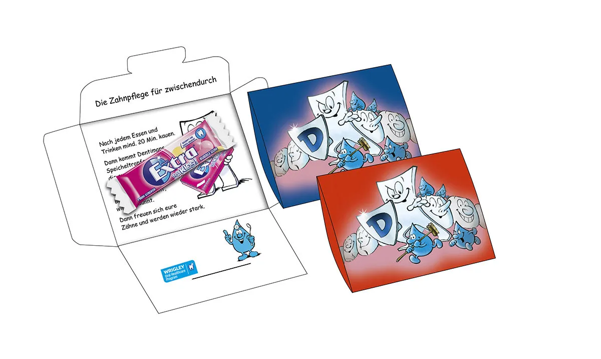 Die kleinen Umschläge mit je einem Streifen Wrigley›s EXTRA® for Kids Bubble Gum gibt es in Rot und in Blau (s. Abbildung 1) in Packungen à 130 Stück exklusiv für die Praxis; die Dentiman-Comics, Folgen 1-4, können kostenlos dazu bestellt werden. Kauft man pro Farbe je eine Einheit, spart man 5 Euro. So kann das Praxisteam Patientinnen und Patienten eine kleine Freude schenken und ihnen Lust auf Prophylaxe machen - und die Praxis bleibt in guter Erinnerung.