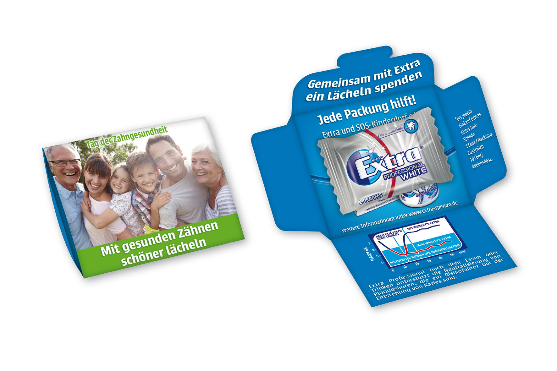 hat der Kaugummihersteller Wrigley im Juli seine Kooperation mit SOS-Kinderdorf e.V., einer bekannten und renommierten Hilfsorganisation, begonnen. Bei jeder verkauften Packung Wrigley’s EXTRA® Kaugummi kommt ein Teil des Erlöses der Zahnpflege benachteiligter Kinder und Jugendlicher zugute. Auch Zahnarztpraxen sind mit Spende ein Lächeln